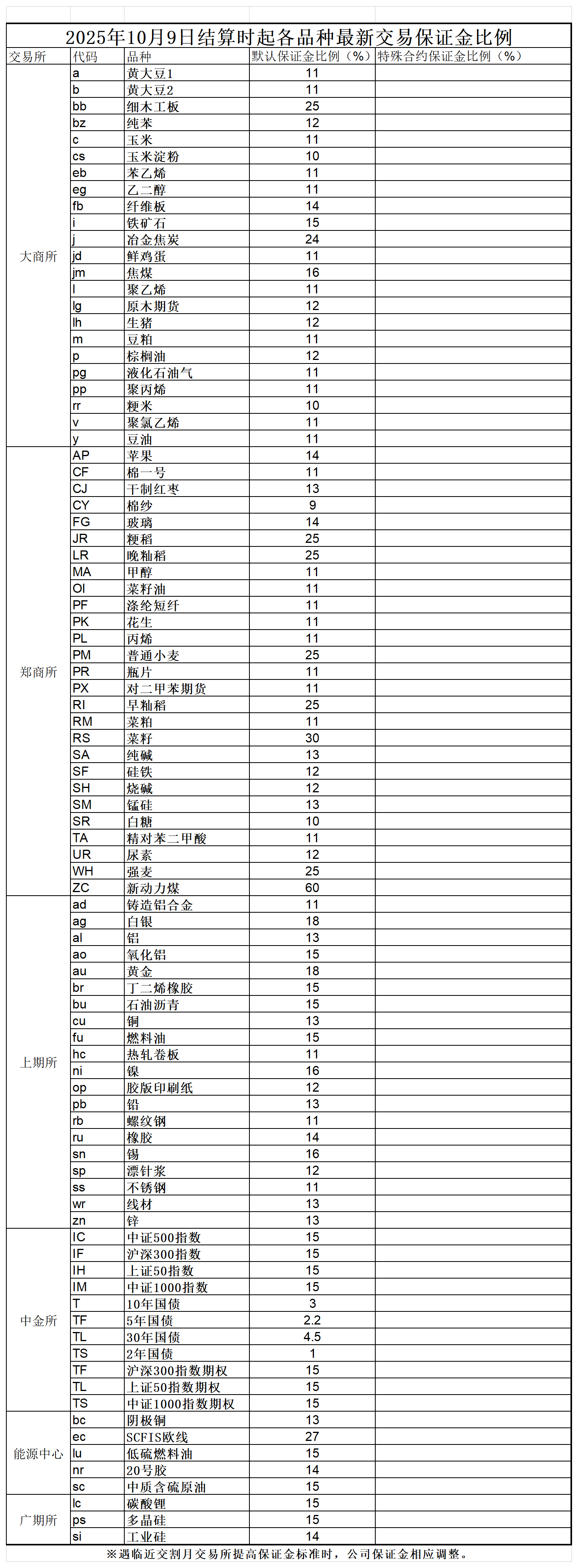 2025年10月9日结算时起各品种最新交易保证金比例 |
